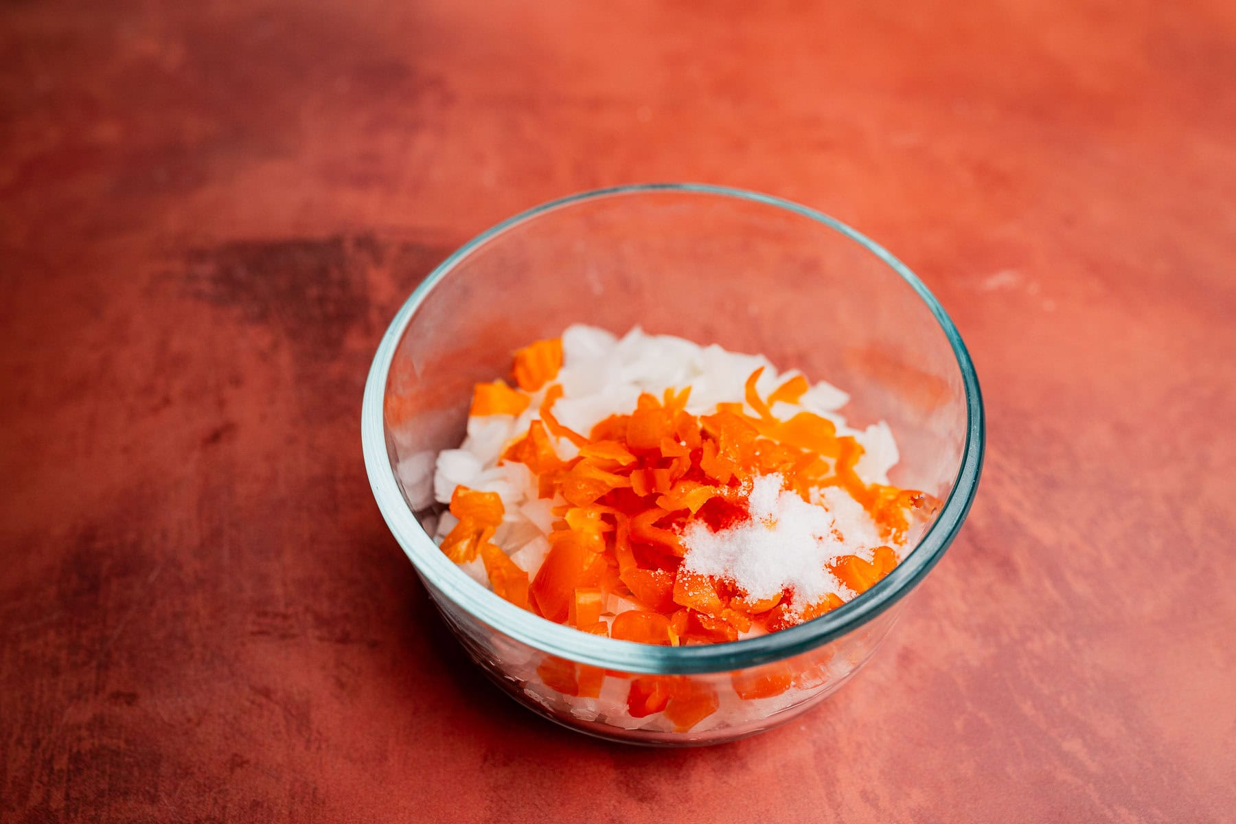 - Place the chopped chiles and onion in a bowl and sprinkle with the salt. Massage gently with your fingers for 30 seconds.
