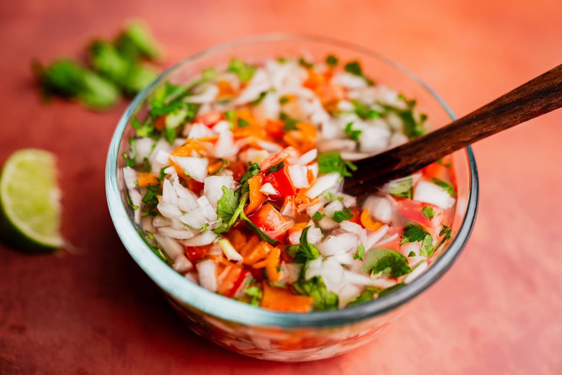 It is made with fresh chile peppers, finely chopped onion and tomato, cilantro, vinegar, lime juice, and salt. The result is a tangy, herbal, and spicy sauce that adds brightness and heat to dishes such as arepas, empanadas, rice and beans, and fried foods.
