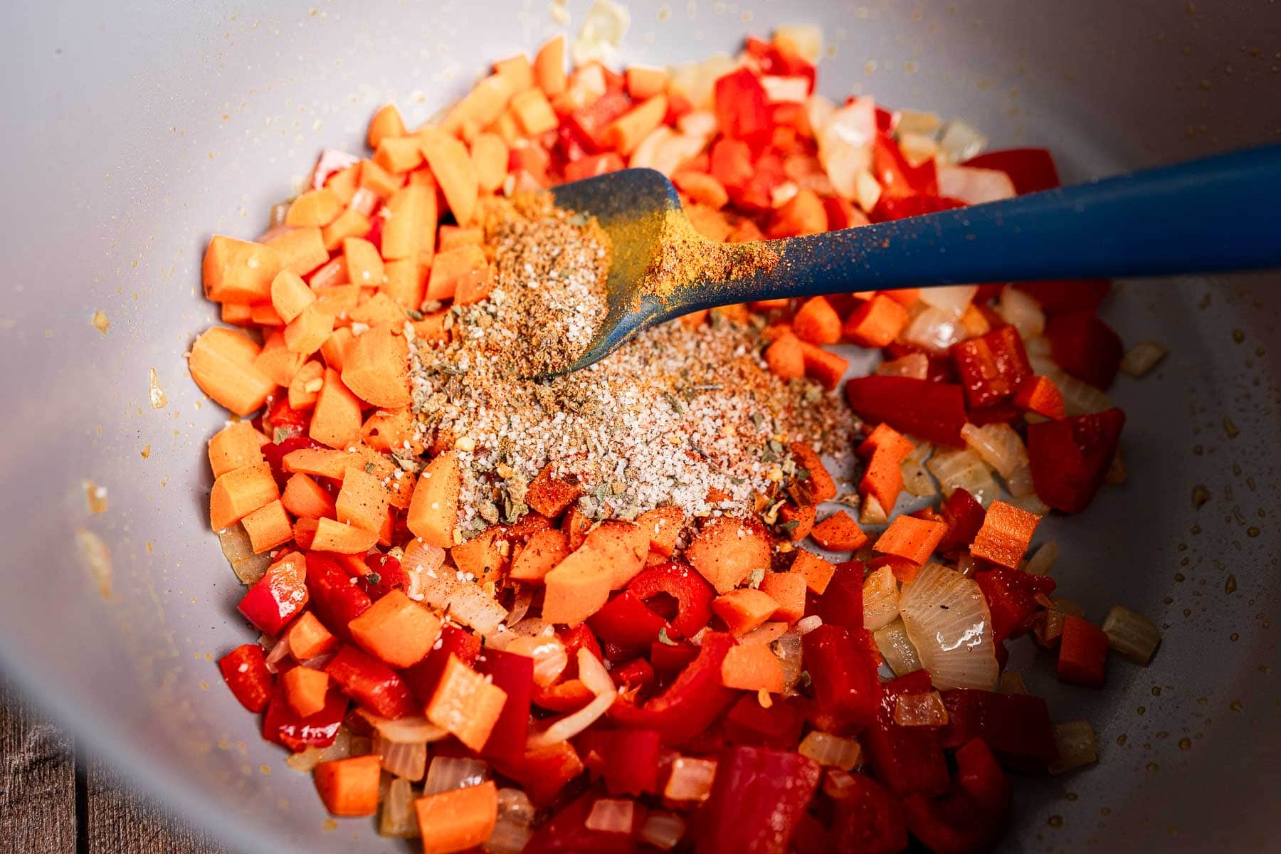 - Stir in the carrots, paprika, cumin, coriander, oregano, turmeric, cinnamon, chili flakes (if using), salt, and pepper. Cook for 1 minute, or until fragrant.