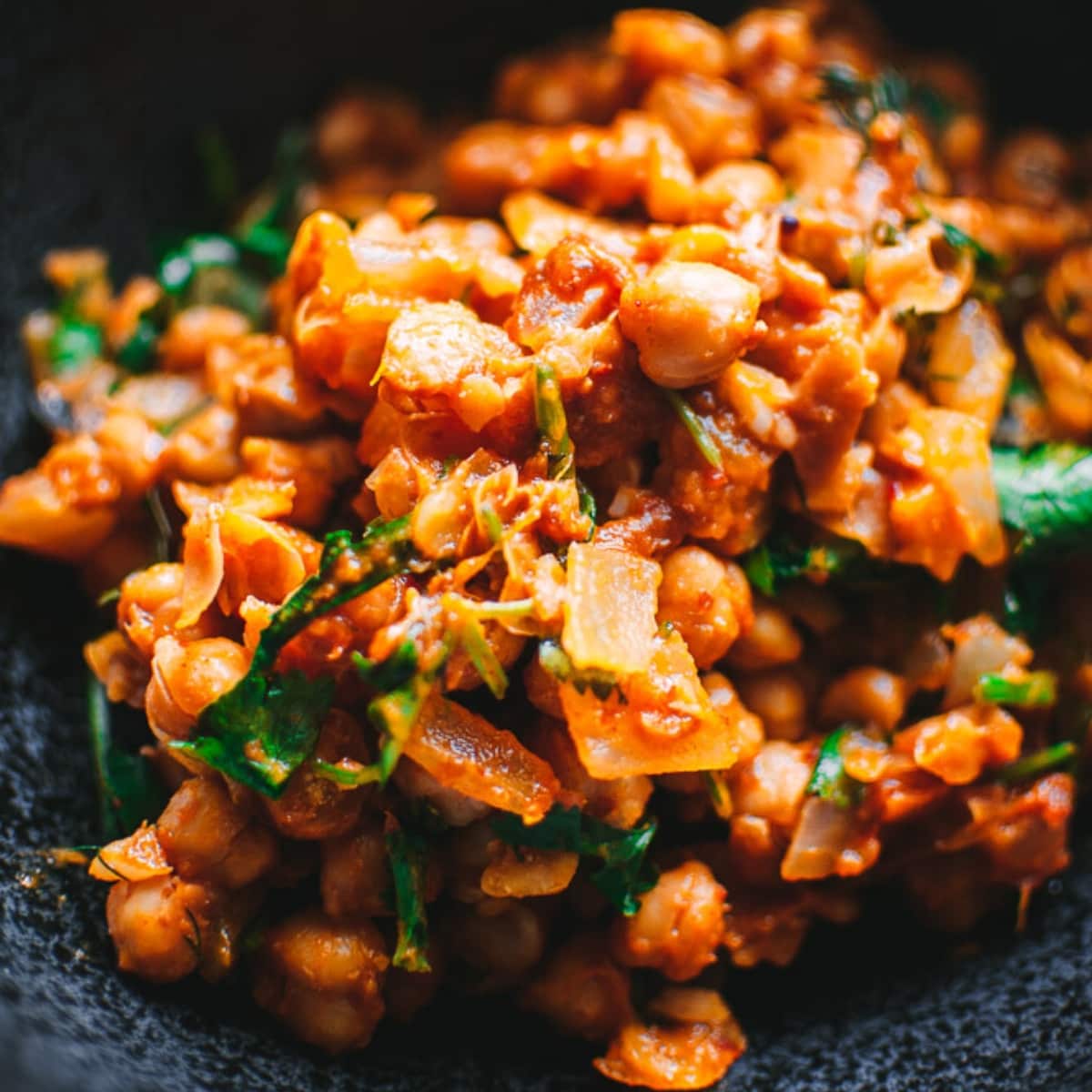A flavorful Moroccan-inspired Harissa Chickpeas dish delicately spiced with orange and fresh herbs. This spicy side dish is vegan, quick + easy to make and bursting with beautiful flavors!