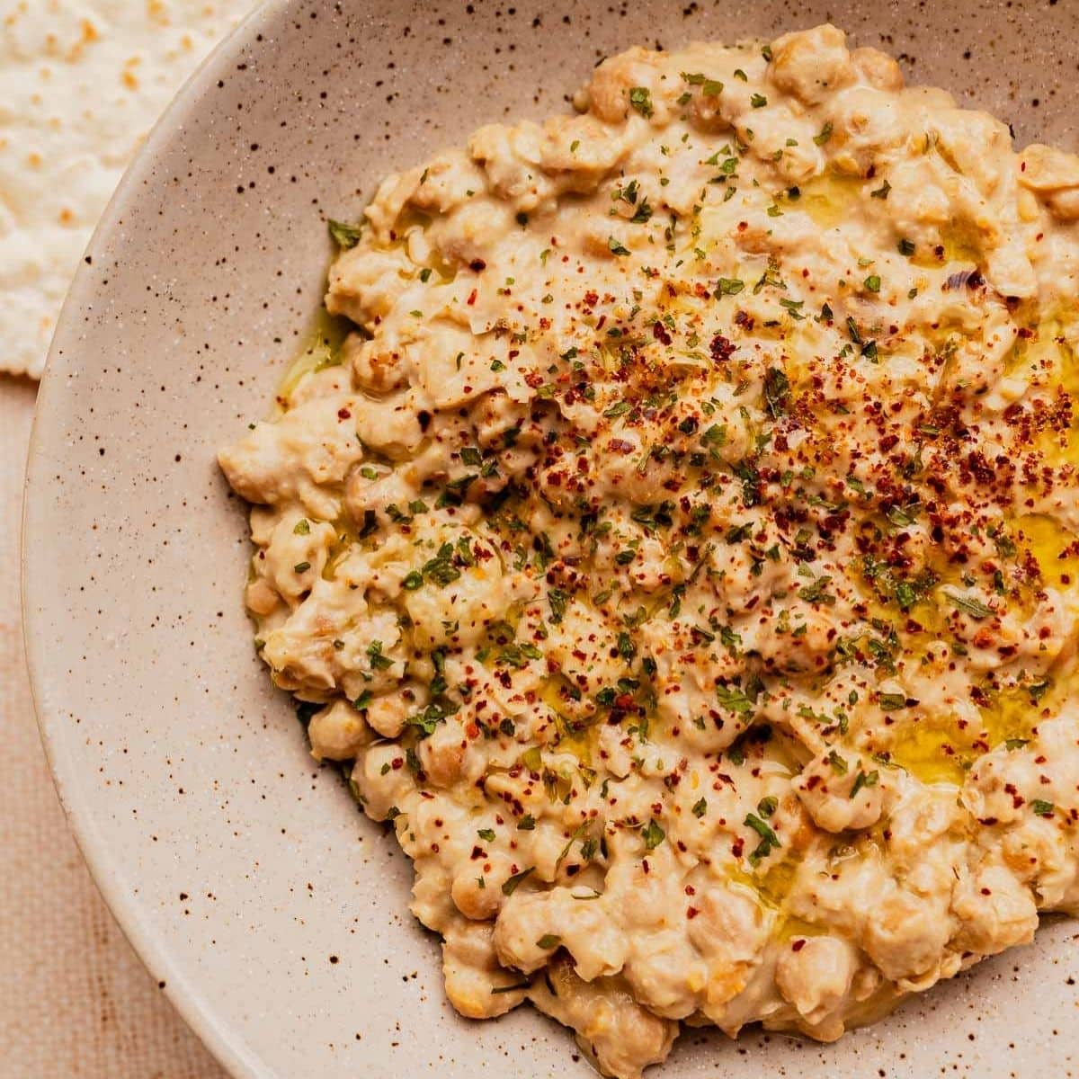 Musabaha is a warm Middle Eastern chickpea dish made by gently heating chickpeas and partially mashing them with tahini, lemon juice, garlic, and cumin until creamy but still textured. Unlike hummus, it is not fully blended and is meant to be served warm, finished with olive oil, herbs, and Aleppo pepper. It is often scooped with pita or flatbread, giving it a dip-like feel.