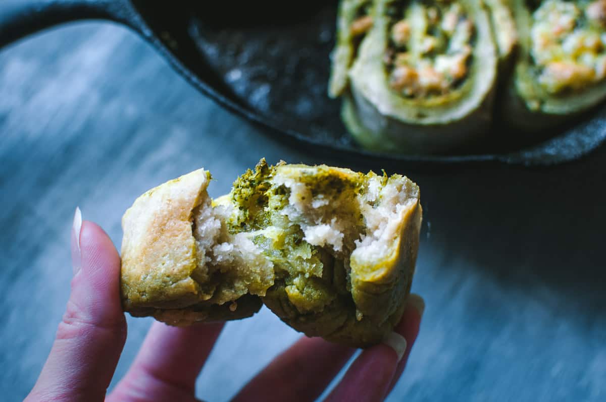 If my oldest had his way, he would eat pesto pizza for breakfast, lunch and dinner everyday! So, I figured it high time I come up with another variation on the matter. I’m super pleased with the results! These are easy for little hands to hold, travel well, freeze well and taste AMAZING!
