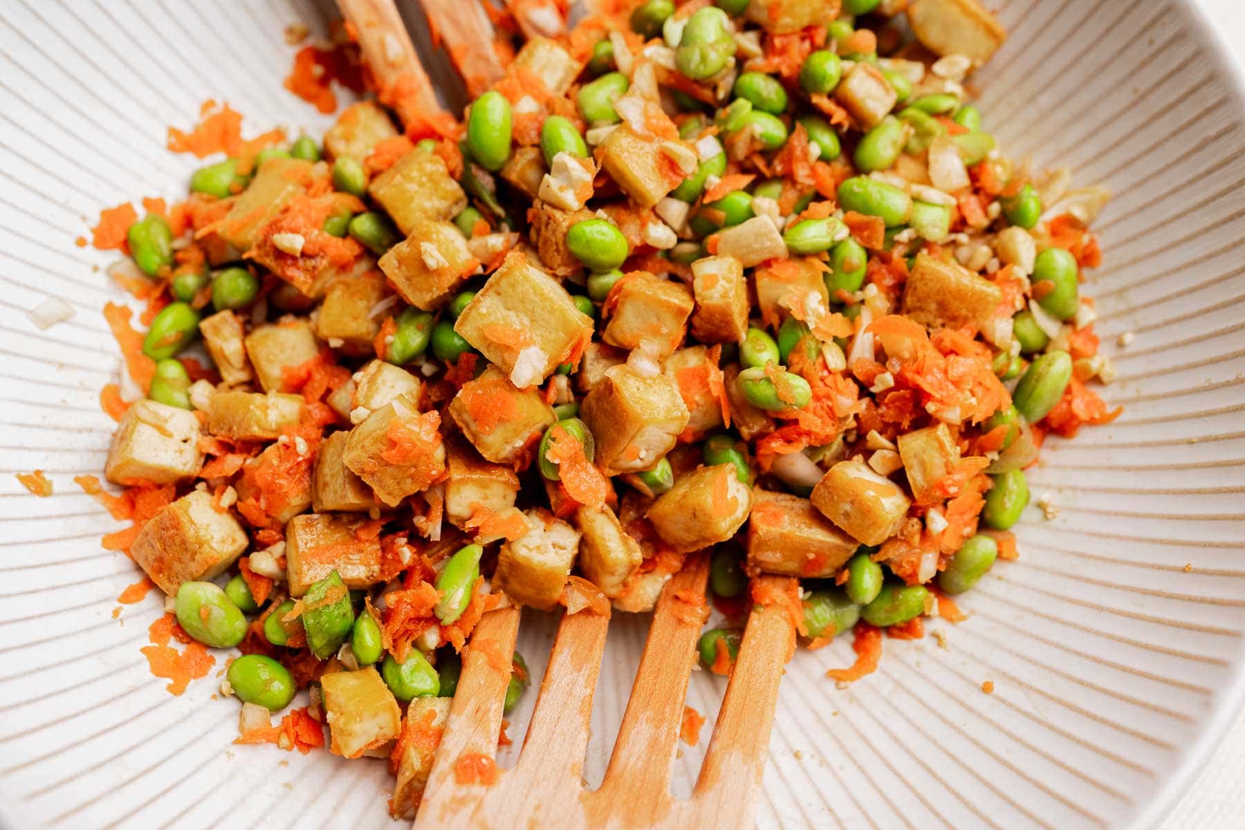 - Add the cooked tofu, edamame, shredded carrots, diced white onion, and crushed cashews to a large bowl.